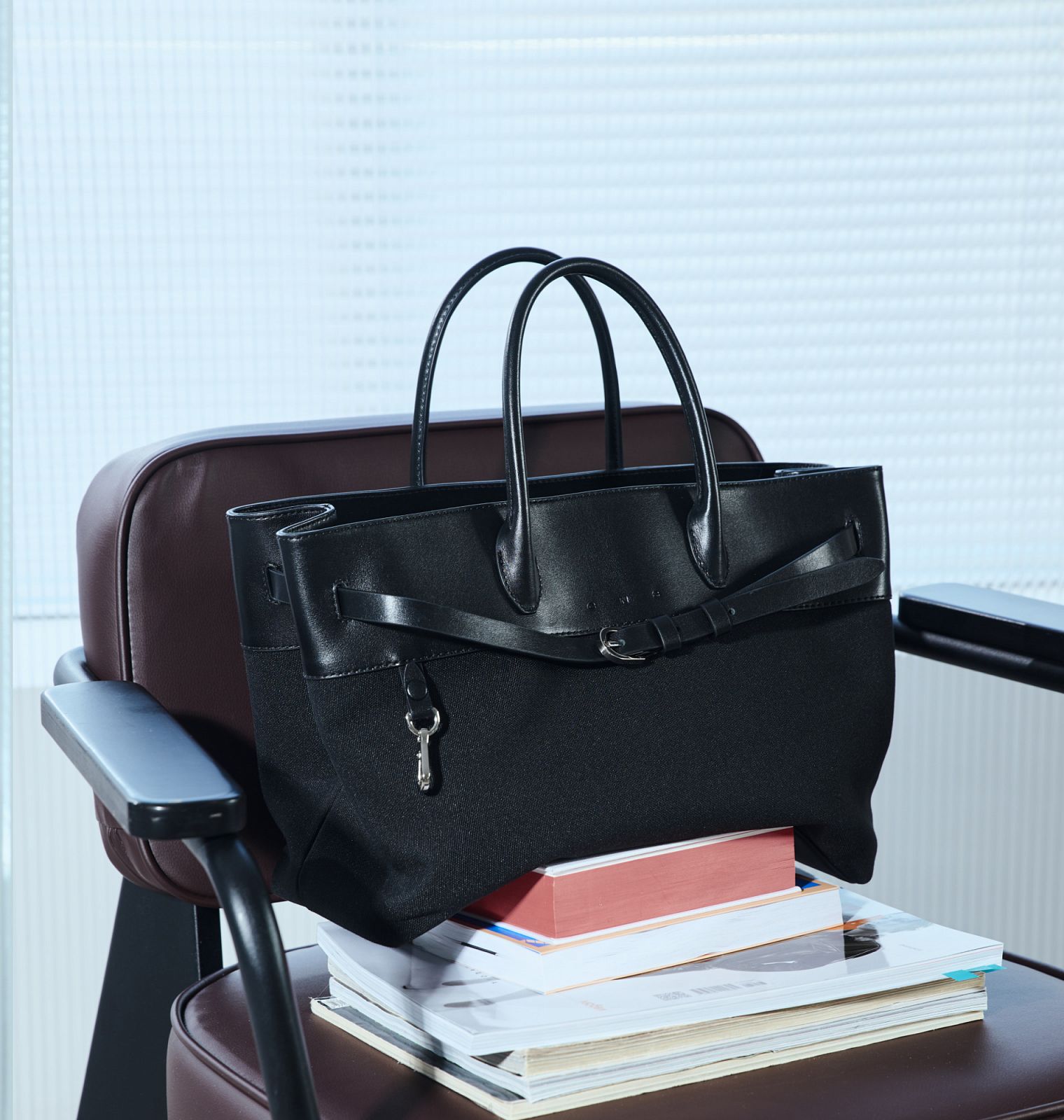Мягкий, но собранный корпус из Twill nylon, контрастная кожаная надстройка — как архитектурный фриз.